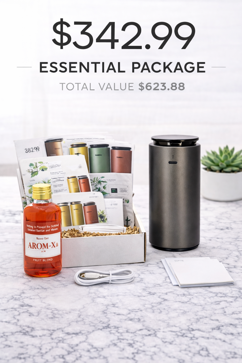 5 premium sprays, 12 blended scents, 12 samples, 3 diffusers and a printable business card with an affiliate QR link.